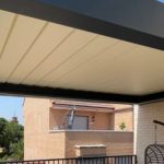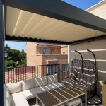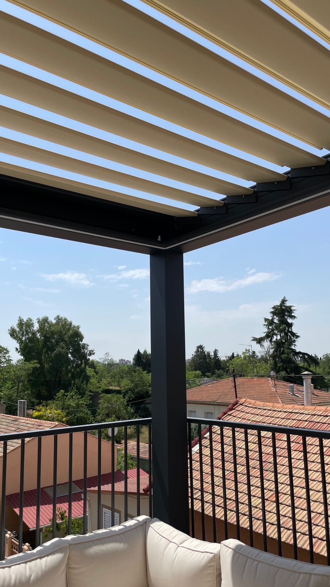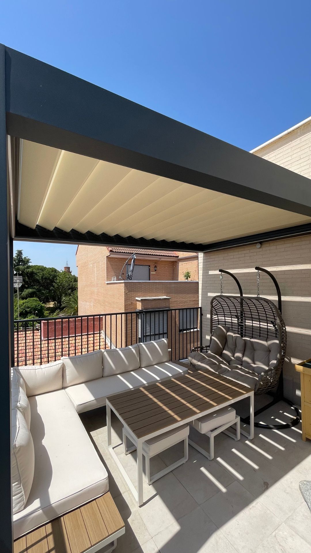 La terrasse, initialement ouverte, a été naturellement réorganisée en deux espaces distincts. D'un côté, un espace repas extérieur protégé par la pergola bioclimatique DURMI (environ 10,50 m²) et, de l'autre, un espace détente avec canapés, idéal pour profiter d'un samedi après-midi entre amis sous le ciel madrilène. L'un des points forts du projet a été la personnalisation des couleurs. Les propriétaires ont choisi le RAL 9016T (sable clair) pour les lames et le RAL 7016T (gris foncé) pour la structure. Cette combinaison crée un contraste élégant qui s'harmonise avec l'esthétique du penthouse, dominé par les tons beiges sur les murs et le gris sur la balustrade.